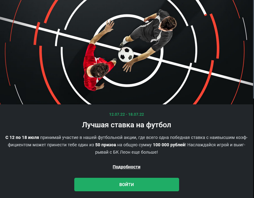 Букмекерская компания «Леон» предлагает всем игрокам бонус до 6000 рублей за сделанные ставки на футбол. Победителями станут 50 человек, которые наберут больше всех очков. Акция продлится до 20.07.2022 г.