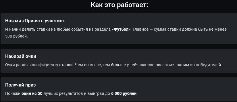 За каждое выигранное пари участнику начисляют баллы. Их количество равняется коэффициенту ставки. Пример: за выигрышную ставку с кэфом 4,5 участник получит 4,5 акционных очка.
