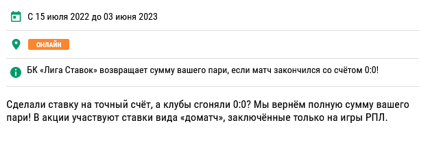 Букмекер «Лига ставок» запустил новую акцию. Если игрок делает ставку на матч РПЛ, который заканчивается нулевой ничьей, БК возвращает сумму пари.
