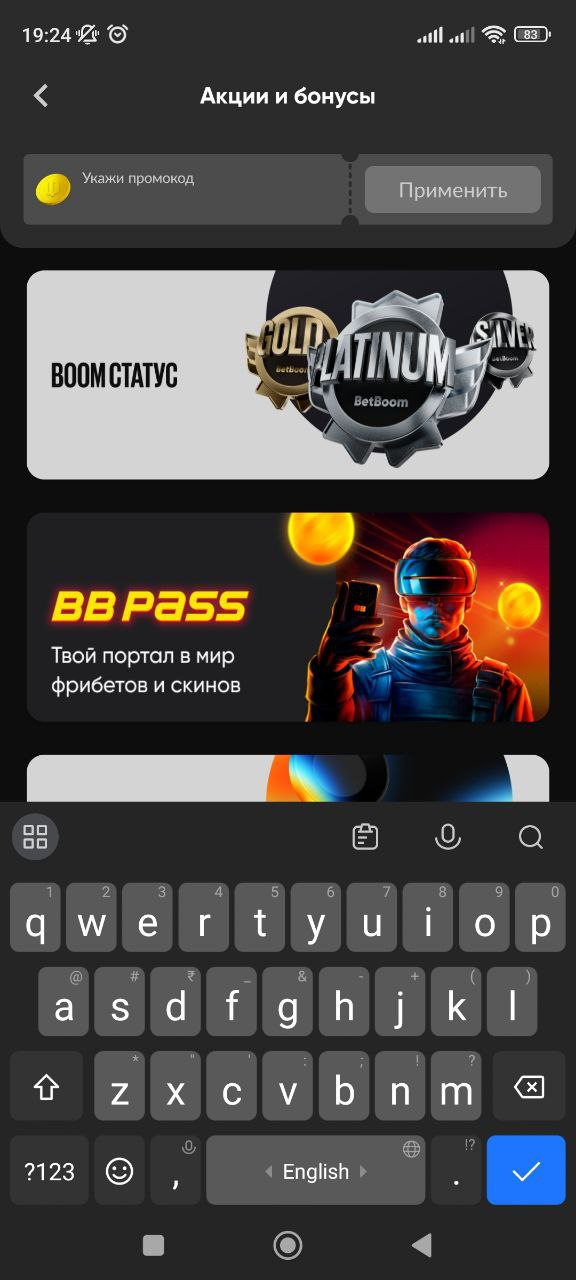 Букмекерская контора «Бет Бум» поощряет новых пользователей. Для постоянных игроков промокоды BetBoom на сегодня не предусмотрены. Фрибеты можно получать за участие в программе лояльности, а также за активность в рамках различных конкурсов, заданий и других акций.