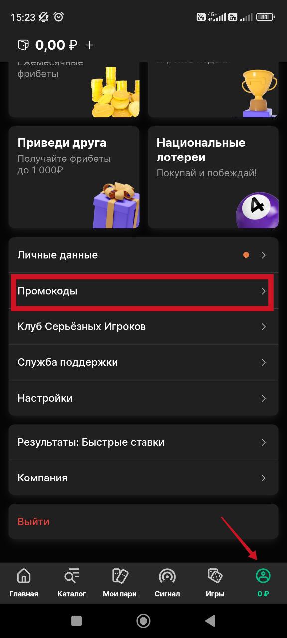 Старые клиенты букмекера активируют коды в личном кабинете. Достаточно зайти в профиль и указать комбинацию в соответствующем поле, при необходимости выполнив дополнительные требования.