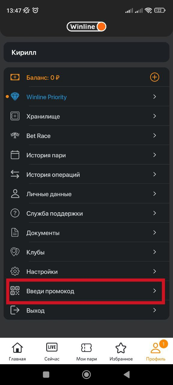 После регистрации, активировать промокод можно в мобильном софте Винлайн. Достаточно авторизоваться, зайти в профиль и найти одноименный раздел. При нажатии на него откроется окошко для ввода символов.
