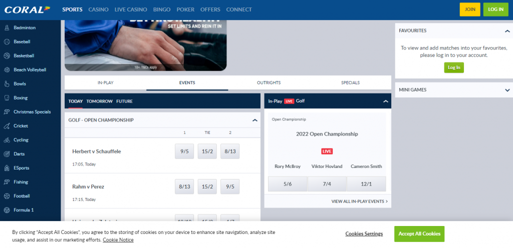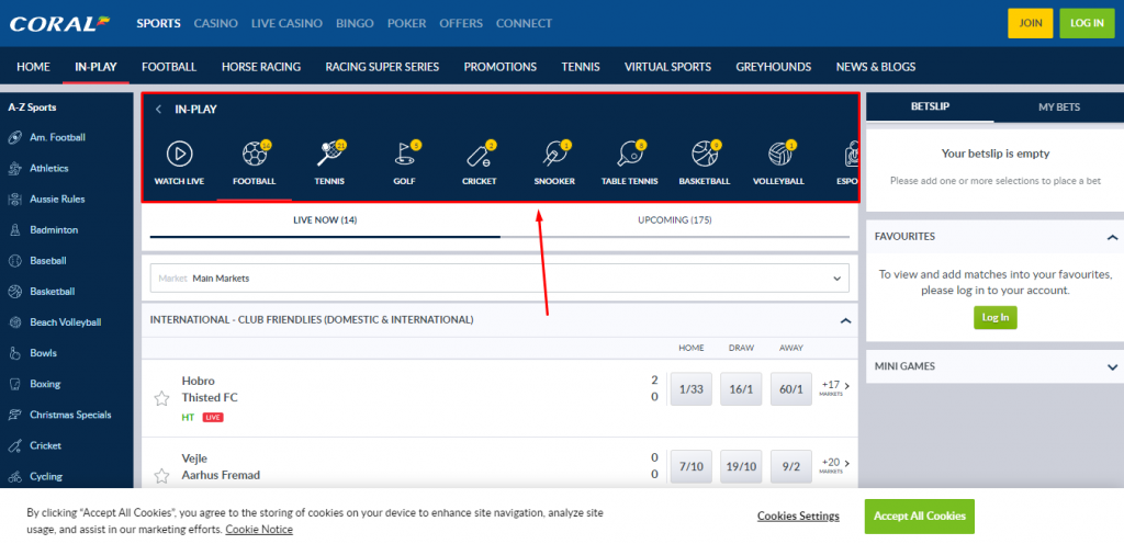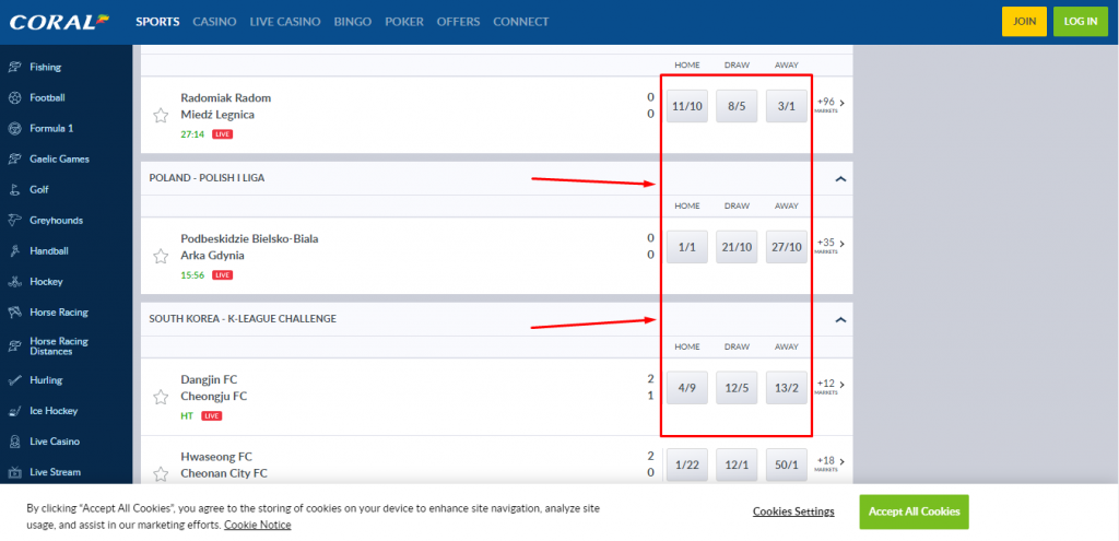 Coral сформировал для беттеров приятную основную линию. Компания рассматривает 30+ видов спорта. Акцент клуб делает на топовые лиги, но могут появиться и второстепенные по значимости соревнования. Хорошую детализацию можно найти у международных встреч.