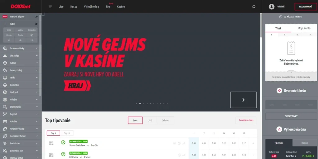 Платформа DOXXbet работает только на словацком языке, возможности переключить на более понятные, например, английский, нет. Однако официальный сайт устроен просто и интуитивно понятно. Если беттер ранее делал ставки у других букмекеров, то разберется за несколько минут. Упрощает навигацию схожесть словацкого и русского языков. Кнопки регистрации и авторизации находятся в верхнем правом углу.