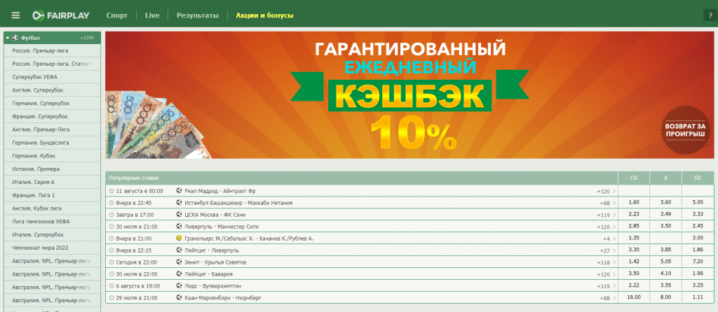 - Широкий охват футбольных событий — основной вид спорта для букмекера. В букмекерской конторе «Фэирплей» можно сделать ставку практически на любой футбольный чемпионат.