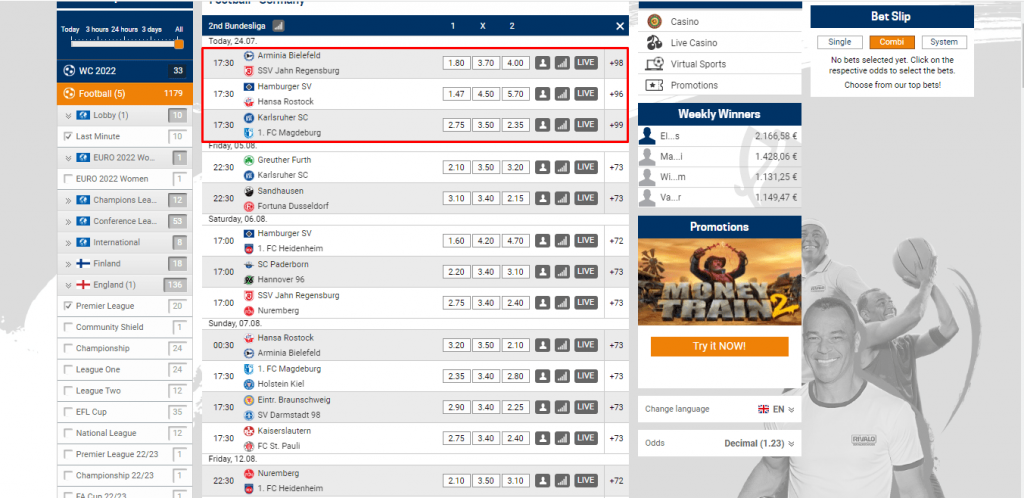 На матчи популярных чемпионатов букмекер дает 70-200 вариантов исходов. Роспись зависит от времени начала встречи. Чем ближе стартовый свисток, тем больше вариантов увидит беттер. К началу встречи даже у игр Бундеслиги 2 можно встретить 100+ исходов.