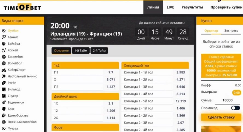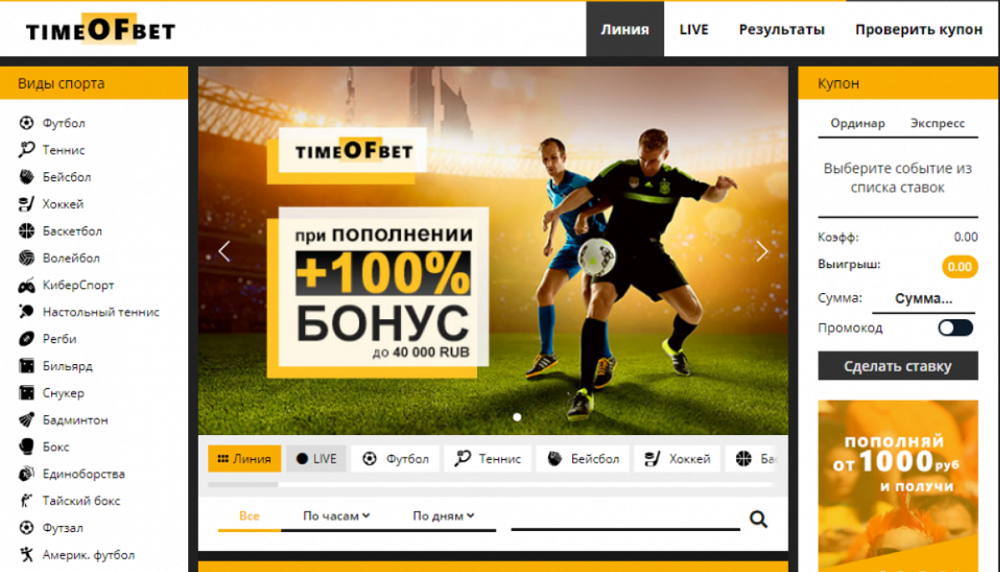 Ежедневно на сайте «ТаймОфБет» представлено порядка 1000 событий из 40 видов спорта. Букмекер предлагает роспись не только на топовые чемпионаты мирового значения, но и менее популярные соревнования национальных лиг. Линия удовлетворит любые запросы беттеров. Ставки можно делать на футбол и водное поло, хоккей и крикет, теннис и керлинг.