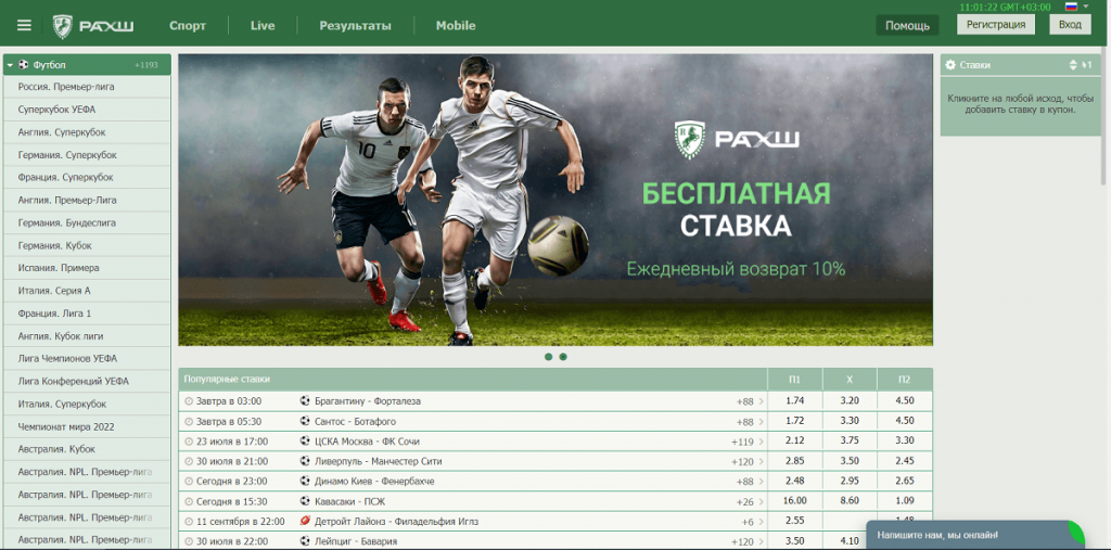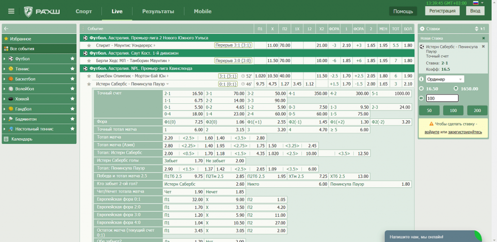 Глубина росписи футбольных матчей – в среднем 300-400 рынков. Неплохой выбор точного счета, несколько вариантов форы, тотала. Дополнительные маркеты – кто забьет, кто забьет п-гол, волевая победа. Ставки принимаются на игру в целом, по отдельным таймам и временным промежуткам.