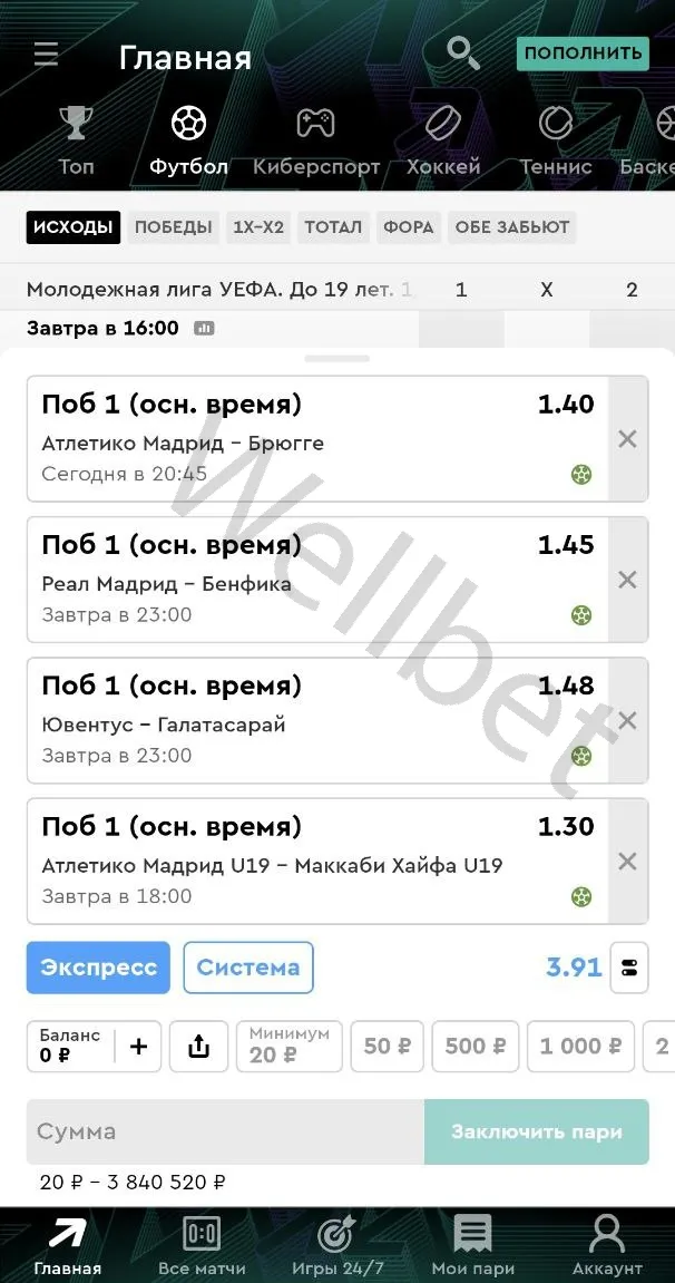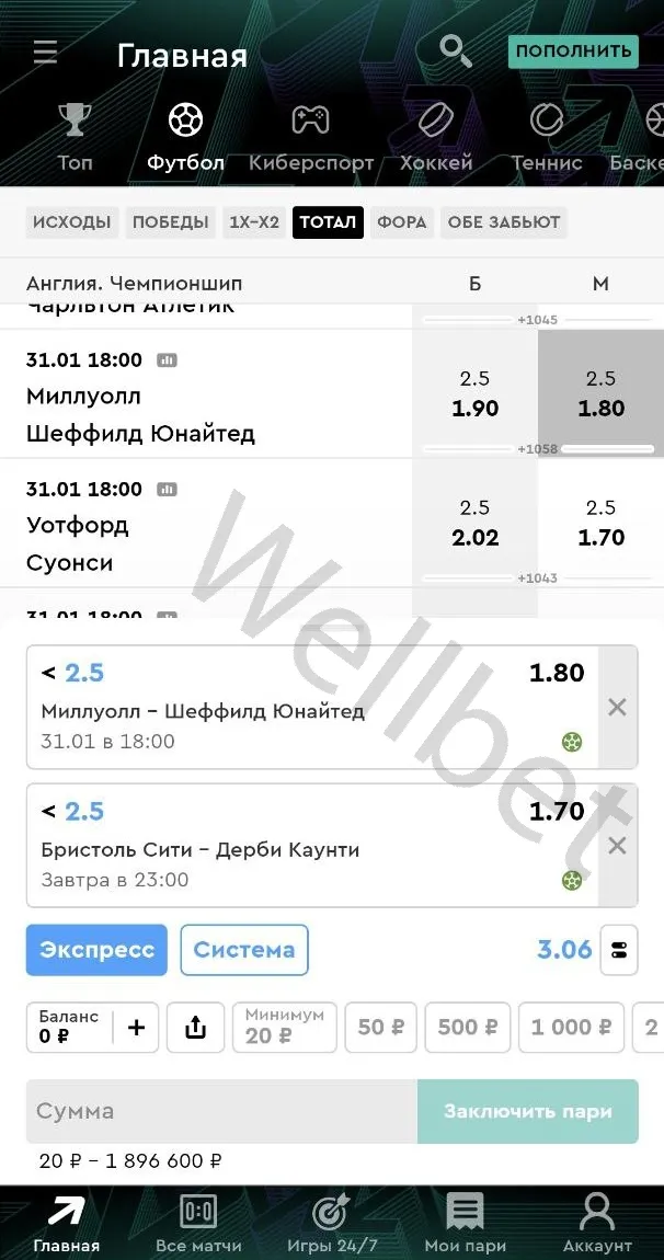 На каждый экспресс делается ставка в 1000 рублей. Если хотя бы в одном матче сыграет ТМ 2,5, то игрок остается в плюсе. Все три ставки проигрывают только в случае, если обе встречи окажутся голевыми.