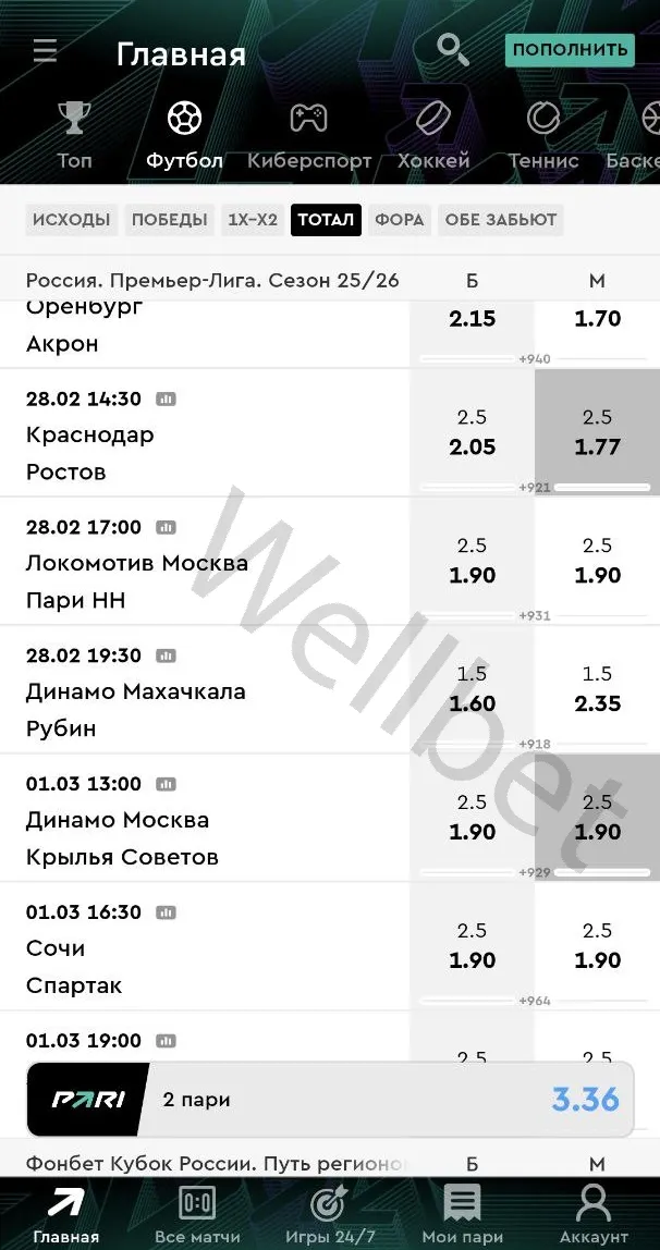 Необходимо выбрать два матча, в которых ожидается небольшое количество голов. Из них составляется основной экспресс. Важно, чтобы общий коэффициент ставки был выше 3. Например, возьмем матчи Краснодар — Ростов и Динамо — Крылья Советов.