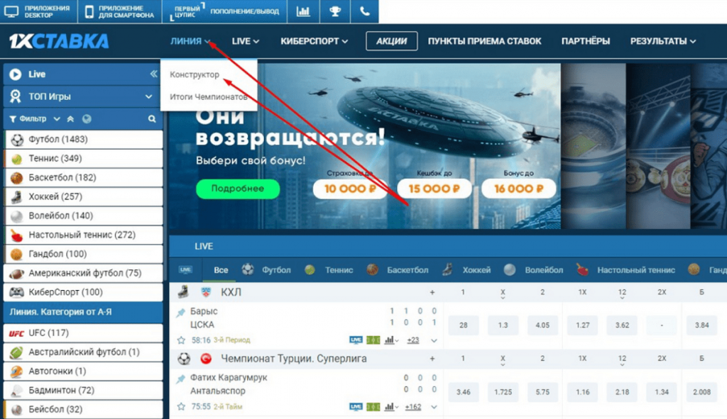 Бет-конструктор придумали и разработали создатели проекта «1хСтавка». Для входа в него необходимо навести курсор на раздел «Линия» и кликнуть соответствующую строку. В конструкторе есть три вида спорта – футбол, хоккей и теннис. Соответственно доступно 15, 10 и 7 событий.