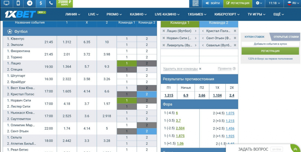 Учитывается индивидуальный показатель команд, входящих в искусственный поединок. Если в бетконструктор добавлены сразу четыре клуба и делается ставка на ТБ 5.5 с коэффициентом 2.25, то суммарно они должны забить больше 5 голов. Если на счету каждого будет только один забитый мяч, то сыграют пари Мультигол 3-4 или 4-5.