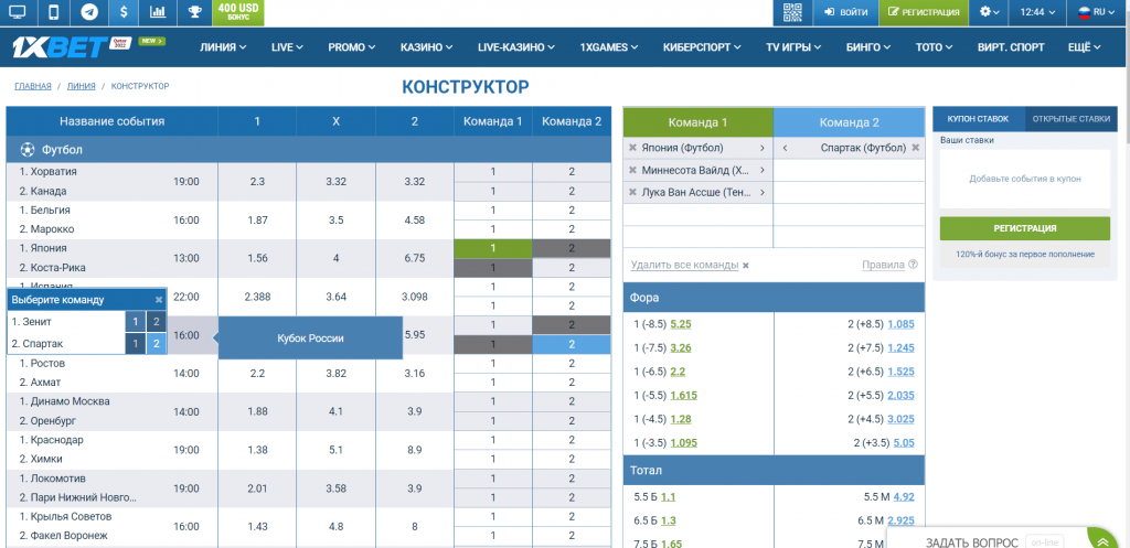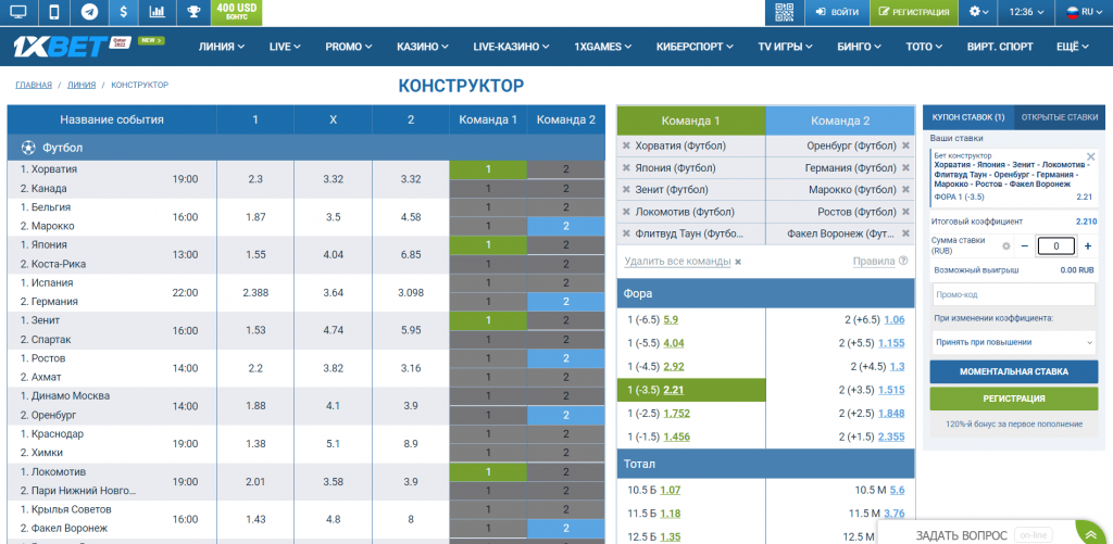 Для ставок обязательно нужно авторизоваться в конторе 1xbet и перейти в раздел конструктора. События, из которых можно собирать команды, постоянно обновляются и исчезают из таблицы по мере завершения матчей. Выбирать соперников можно двумя способами:
