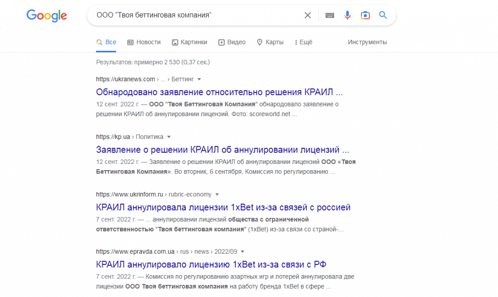 Правда, законной деятельность конторы в Украине стала ненадолго. Уже в сентябре 2022 г. КРАИЛ отозвал ранее выданную лицензию. Поводом послужило российское происхождение бренда «1хБет».