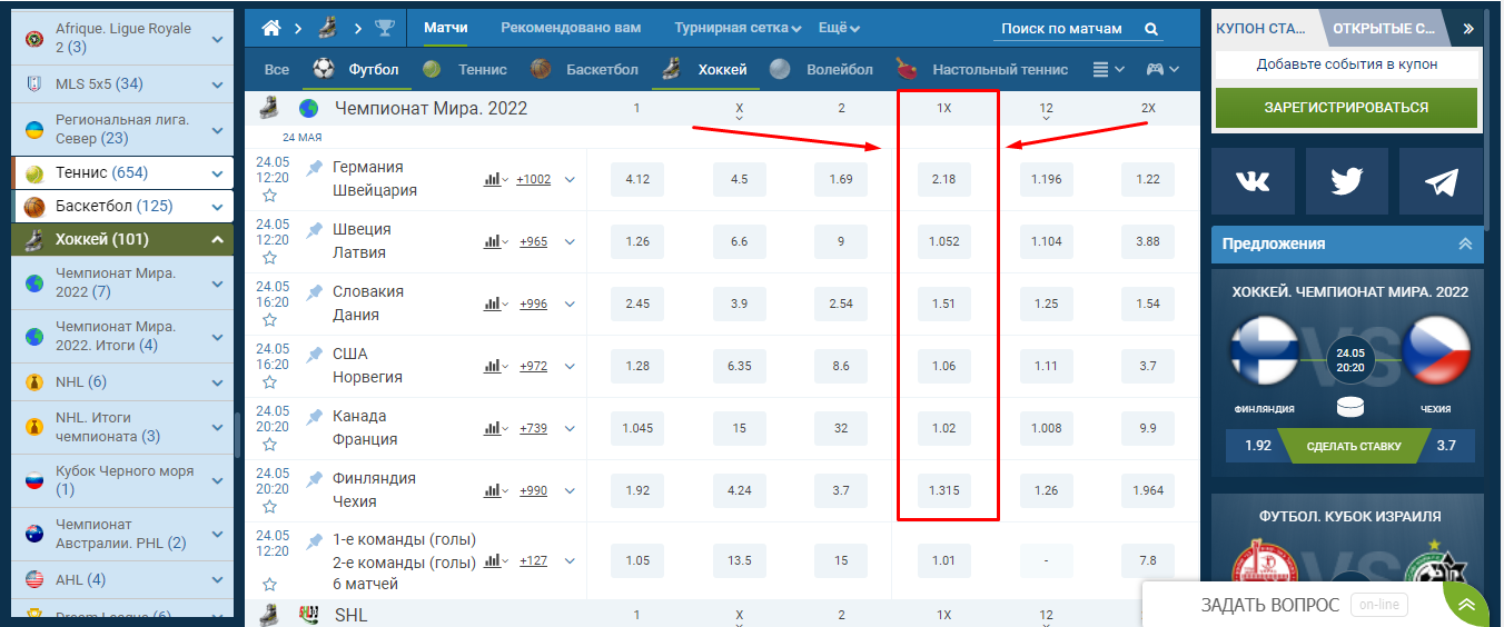 Понять, что такое 1х в ставках, труда не составит. С хоккеем ситуация аналогичная. Игрок ставит на победу команды или ничейный результат. Однако есть нюансы. Ничья в матчах невозможна. При равной игре за 3 периода встречу переводят в овертайм. Игрок ставит на победу хозяев или дополнительное время. Возврат по пари невозможен, коэффициент будет ниже, чем у ставки П1.