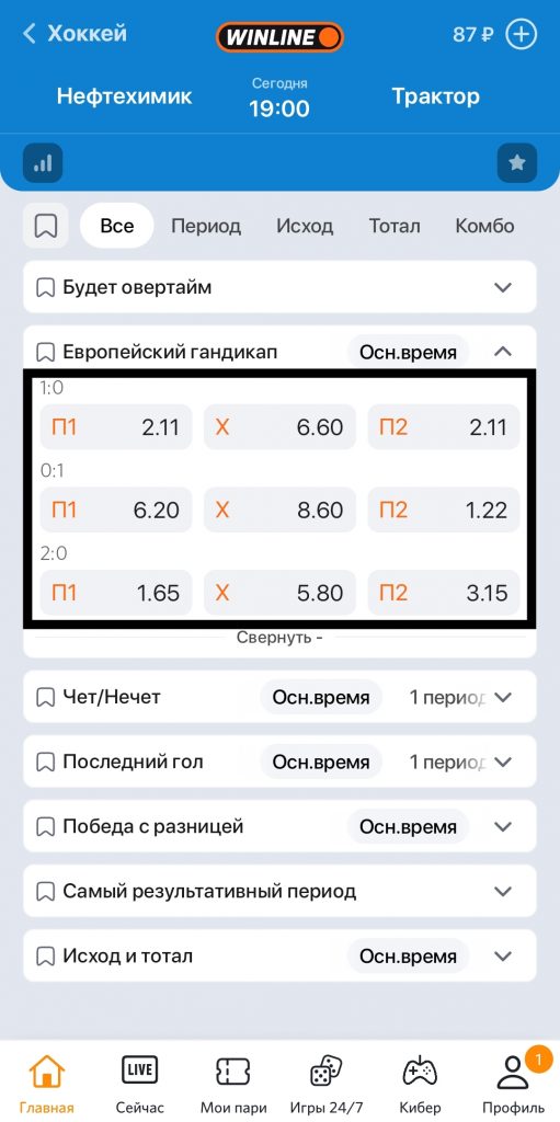 Как правило, для хоккея букмекеры не предлагают широкой росписи. Например, для игры чемпионата КХЛ «Нефтехимик — Трактор» был предложен европейский гандикап только на основное время.