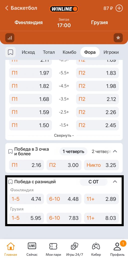 Рассмотрим игру «Финляндия – Грузия», где первая команда является фаворитом. Хозяевам даются варианты исхода матча в формате «Победа» с разницей 1-5, 6-10 и 11+ очков. Чтобы пари выиграло, спортсменам из Финляндии необходимо обойти соперников, выигрывая с выбранным преимуществом. Такая разновидность ставки не сыграет, если первая команда не попадет в диапазон значений.