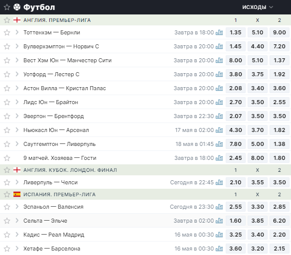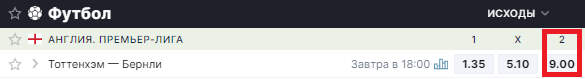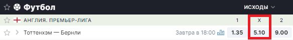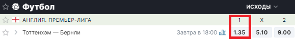 Например, рассмотрим игровой день английской Премьер-лиги. Возьмем матч «Тоттенхэм» – «Бернли». Если каппер хочет поставить на победу «Тоттенхэм», то ему нужно будет нажать на «1»: