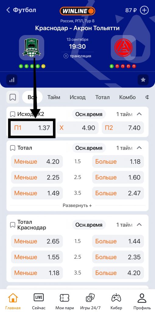 Ставка на команду 1 (первое число) означает, что выиграет Краснодар. Заключив пари П1 на 1 000, в случае выигрыша вы получите 1000 х 1.37 = 1370 рублей. Но если поединок завершится вничью или победой гостей, то вы проиграете сумму ставки.