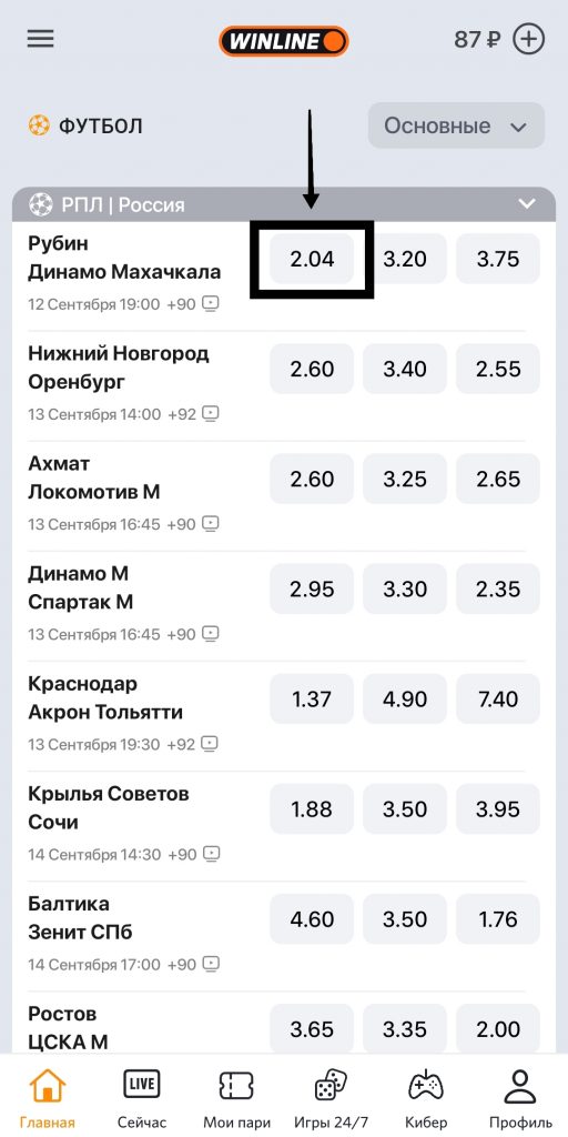 Например, рассмотрим игровой день российской Премьер-лиги. Возьмем встречу «Рубин — Динамо Махачкала». Если беттор хочет поставить на победу Рубин, то ему нужно будет нажать коэффициент 2.04 (П1):