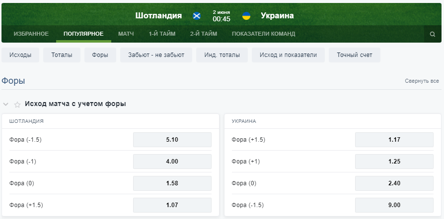 В российских легальных конторах DNB обычно обозначается форой Ф (0). Как видим, коэффициент на команду Украины выше, поэтому именно на это событие нужно сделать ставку. Согласно основной стратегии результат, не включающий ничью, трактуется в пользу более слабой команды. Исключение – это слишком большой разрыв в классе соперников.