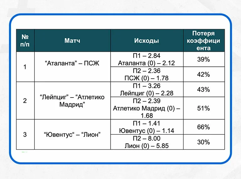 Ниже указаны потери по коэффициентам в матчах ЛЧ:
