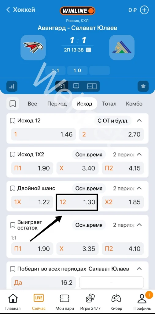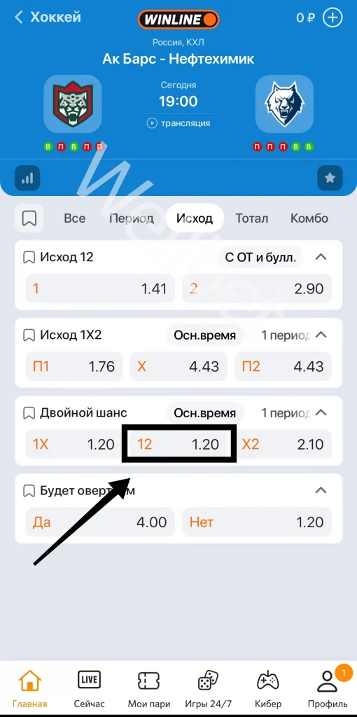 Только минус у тактики тот же. Котировки обычно низкие, и при использовании стратегии в хоккее нужно ждать нужных результатов. Рассмотрим на примере. В матче КХЛ Ак Барс и Нефтехимик букмекер не счел равными противниками. Коэффициент на победу первого клуба равен 1.41, а второго — 2.90. Контора предлагает ставить на событие 12 с котировкой 1.20.