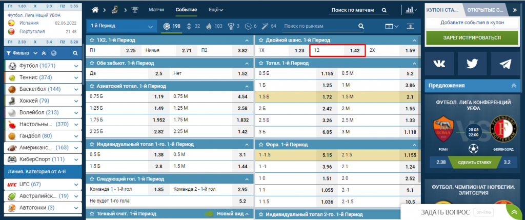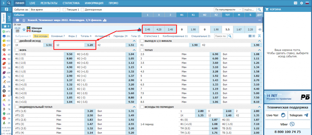 Только минус у тактики тот же. Коэффициенты низкие, и при использовании стратегии нужно ждать нужных результатов. Рассмотрим на примере. В матче ЧМ-2022 Швецию и Канаду букмекер счел равными противниками. Коэффициенты на победу каждого клуба — 2.45. На событие 12 букмекер предлагает ставить с котировкой 1,2.