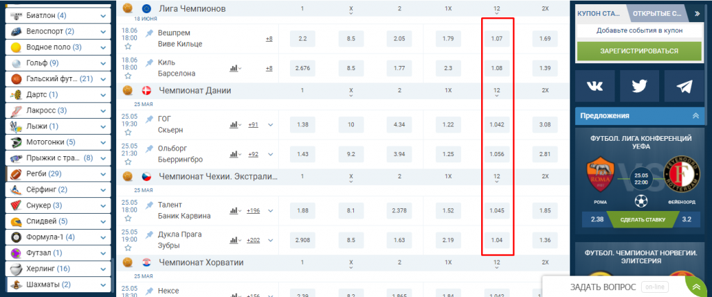 Мы разобрались, что значит исход 12 в ставках. Однако следует рассмотреть возможные варианты игры с этим маркетом в разных видах спорта.