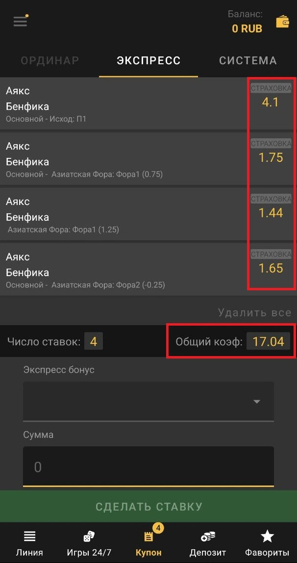В экспрессах ставки на азиатскую фору рассчитываются, как в ординаре. Часть суммы делится, от этого исходят при подсчете выигрыша.