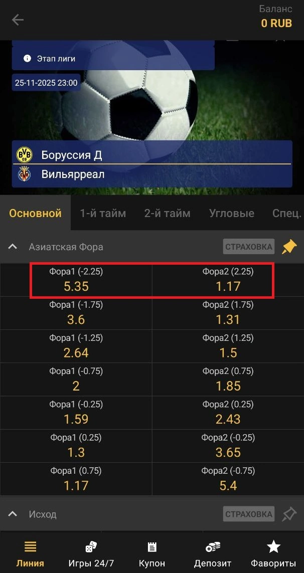 Положительная азиатская фора (+2.25) позволяет сделать ставку на андердога со страховкой. Игроки могут ее использовать, когда уверены, что аутсайдер не потерпит разгромное поражение и может вывести матч вничью или одержать волевую победу.