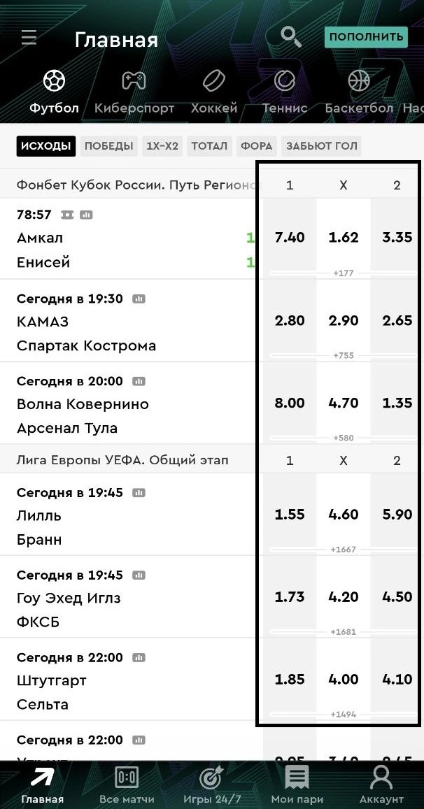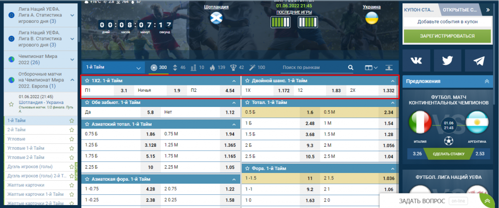 - Выбрать тип исхода — 1х2 или двойной шанс.