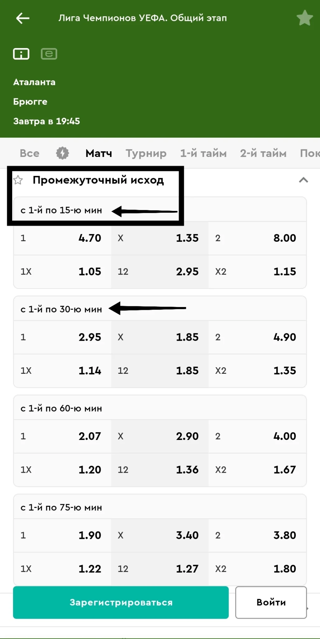Ставки на фактический результат игры к конкретной минуте принимают лишь некоторые букмекеры. Данный маркет компании стараются добавлять для игр популярных лиг: