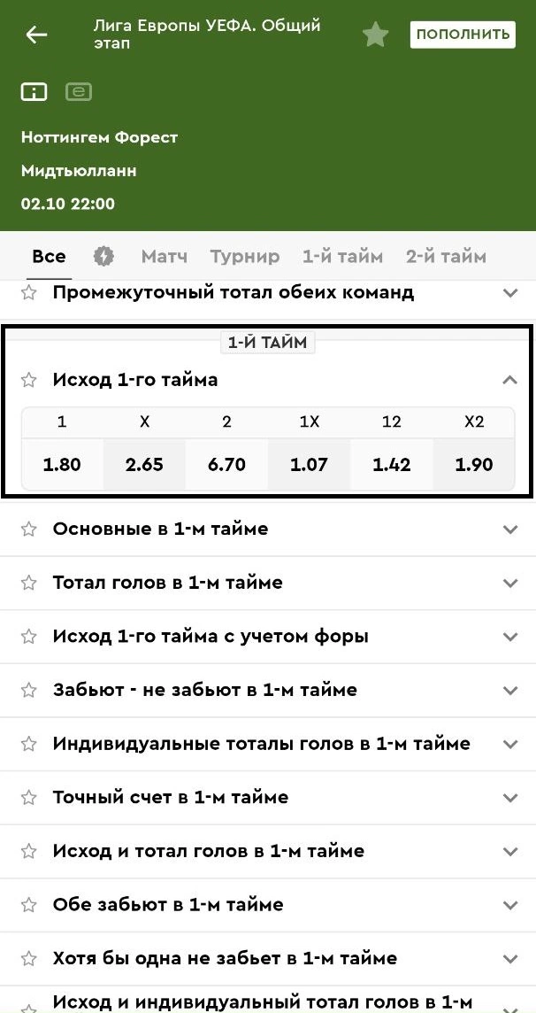 Клиенту букмекерской конторы предстоит определить победителя конкретного тайма. БК дает варианты П1, Х, П2. Некоторые конторы добавляют в роспись двойной шанс для 45 минут игры. При расчете ставки оператор учитывает компенсированное время.