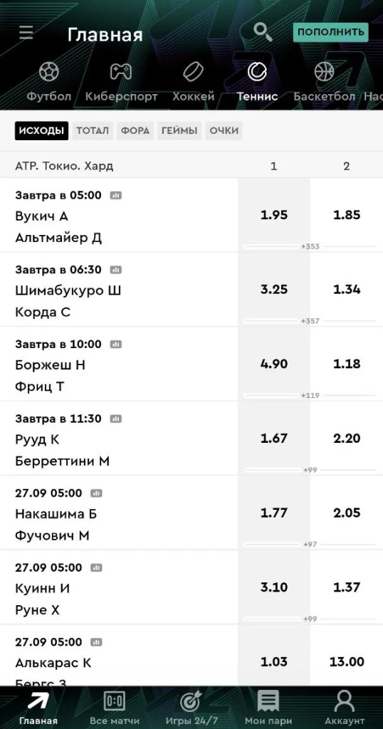 У хоккея и футбола основное время игры может завершиться дополнительными таймами. В теннисных матчах возможно 2 результата: П1 или П2. Вариант ставки Х не предусмотрен. Пари на победителя бывают 3 видов: сет, гейм, матч.
