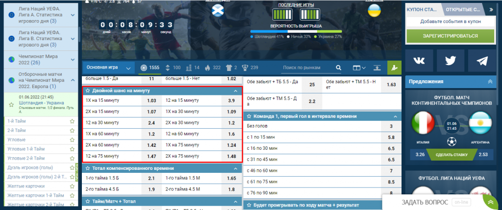 Играть на таких исходах сложно. Беттеру требуется детальный анализ статистики матча. Нужно учесть статистику, вероятные составы, мотивацию и другие факторы. К минусам можно отнести низкие лимиты. Указанный вариант исхода для БК остается диковинкой. Входить в игру с большими инвестициями компании не позволят. Встречаются также варианты двойного шанса на минуту.