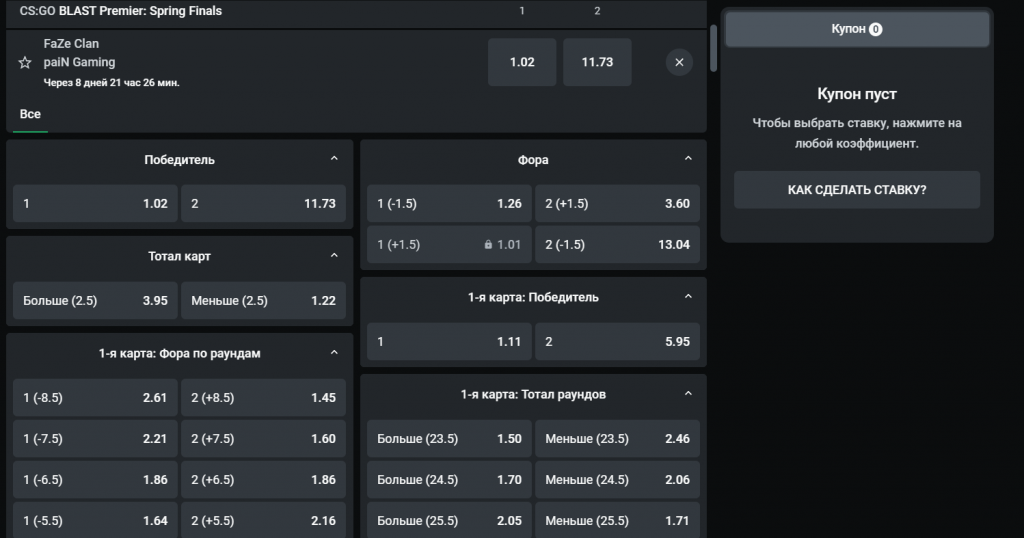 Роспись исходов для игры Counter-Strike включает в себя многие популярные рынки, в том числе тотал и фору. Поэтому найти «коридор» в КС можно так же легко, как в любом другом игровом виде спорта.
