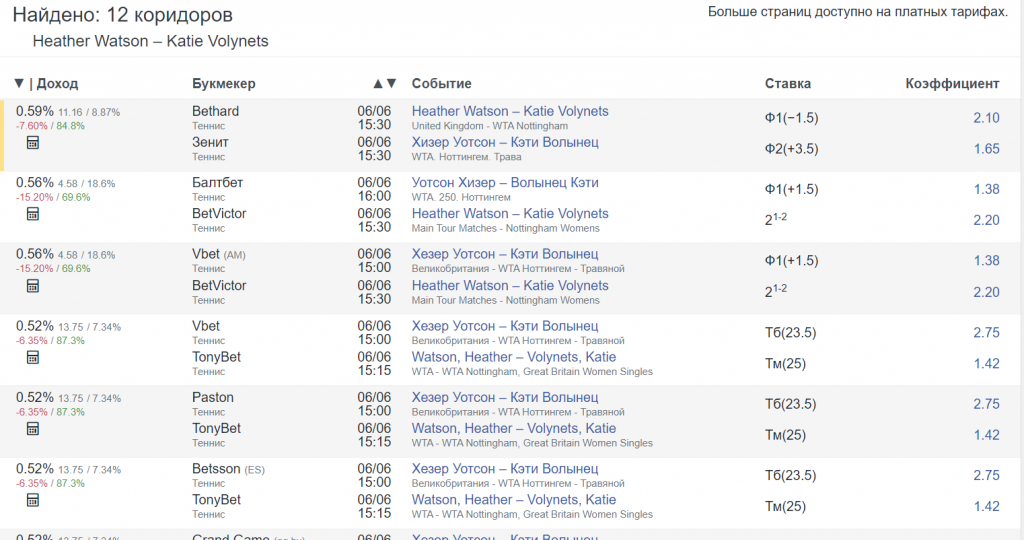 Алгоритм работы не отличается от ручного поиска. Сканер анализирует линии десятков букмекеров и сравнивает коэффициенты, используя специальные формулы. После этого возможные «коридоры» выдаются в виде таблицы.