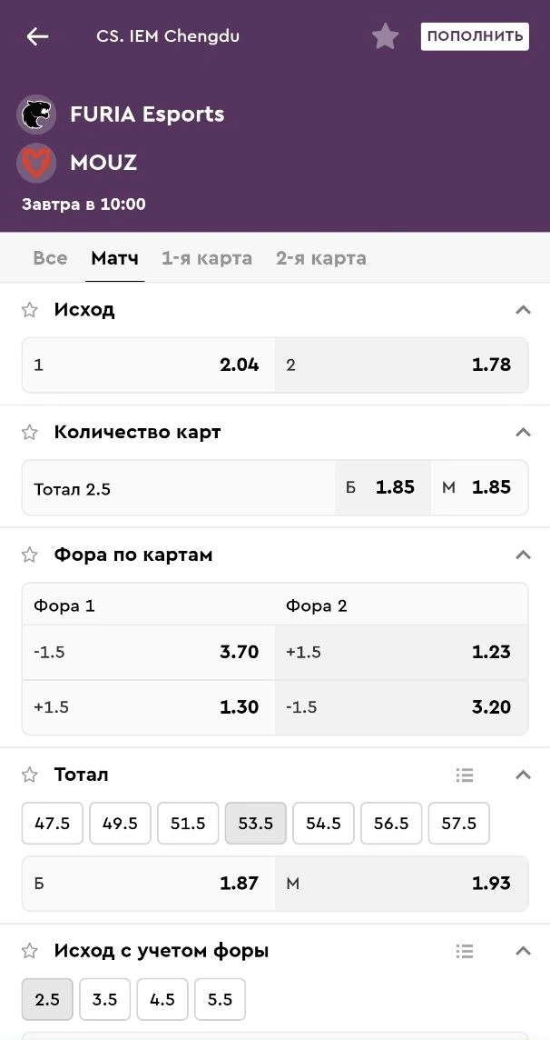 | Киберспорт | Исходы, тоталы карт, фора по картам |