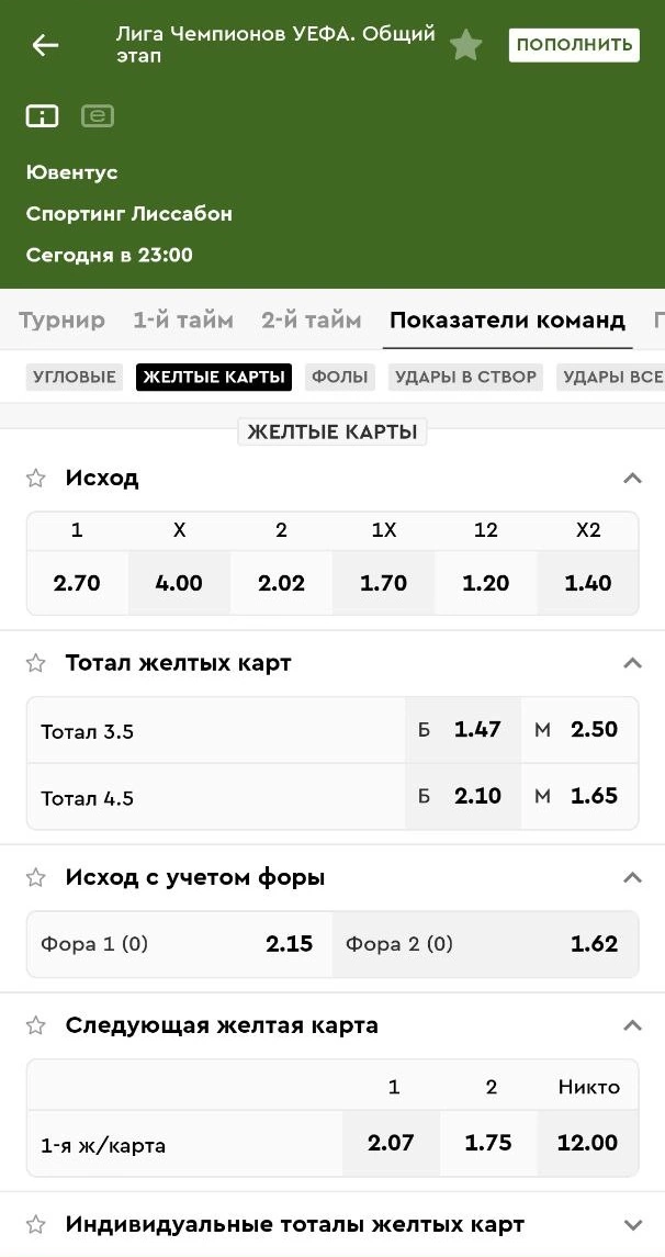 Количество предсказанных желтых карточек зависит от накала событий в матче. В среднем рекомендуется играть на ТБ 4.5 в случае, если до 70-й минуты были показаны 2 желтые карточки.