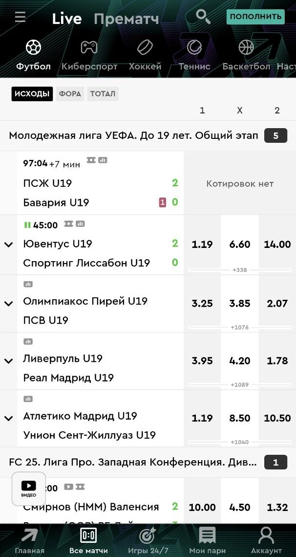 | Футбол | Основные исходы, тоталы, в т.ч. индивидуальные, форы, фолы, угловые |