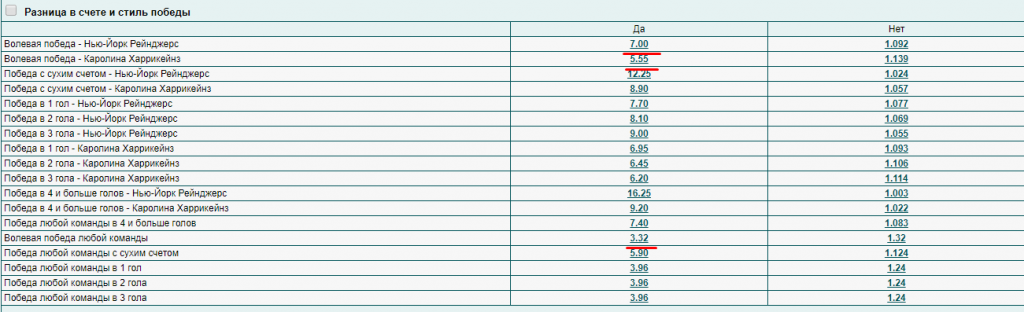 В хоккее также есть возможность заключить пари на волевую победу. Подобные исходы в этом виде спорта происходят чаще, так как хоккей более динамичен, чем футбол. В играх забивается больше голов, часто аутсайдер может открыть счет. Соответственно, коэффициенты на такие события ниже, чем в футболе. На волевую победу любой команды дают немногим больше, чем просто на победу одного из участников матча.