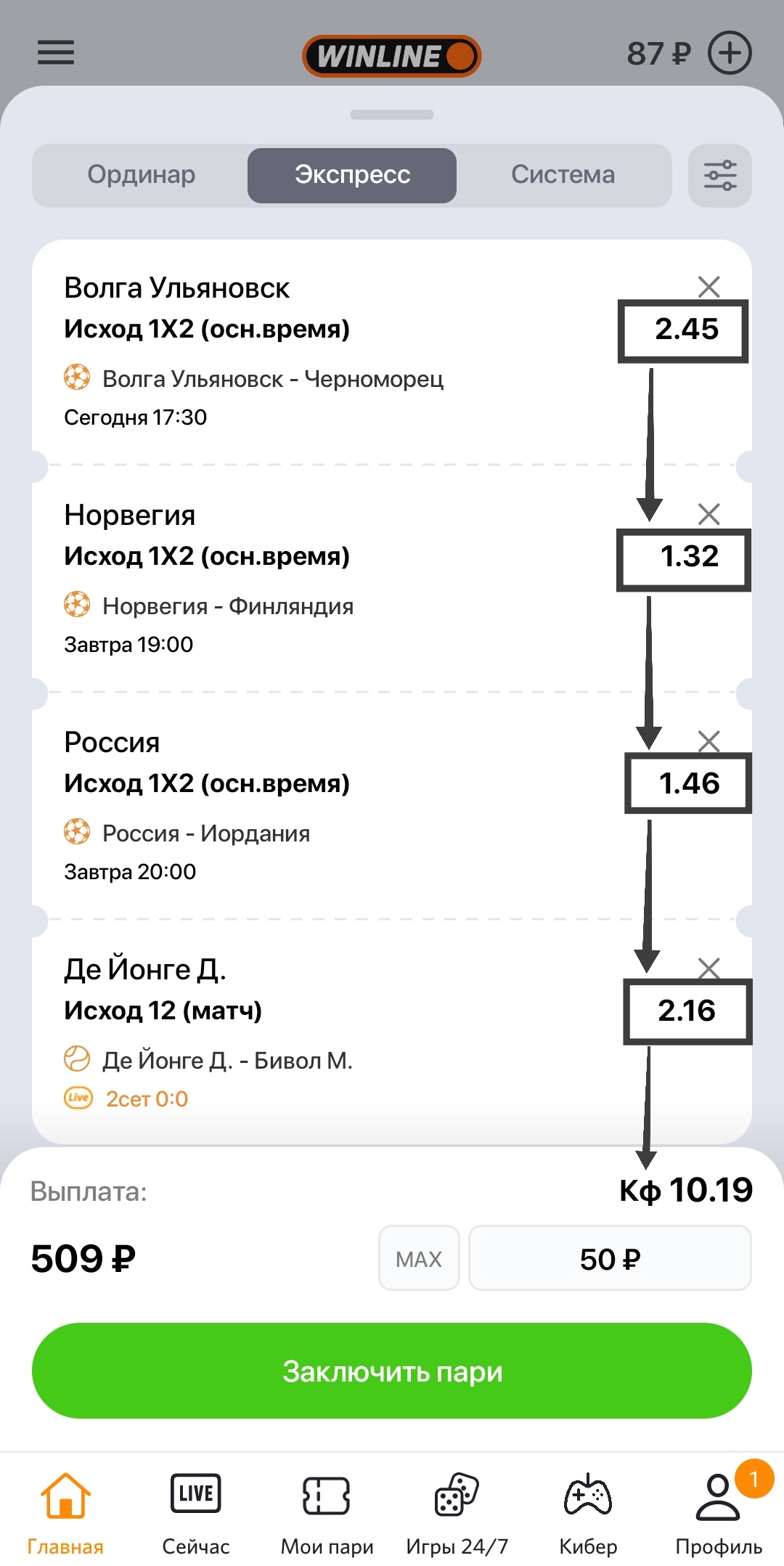 Тогда выигрыш при пари в 1000 рублей у вас составит 4160 рублей. Но при условии, если в экспрессе Норвегия, Россия и Де Йонге выиграют.