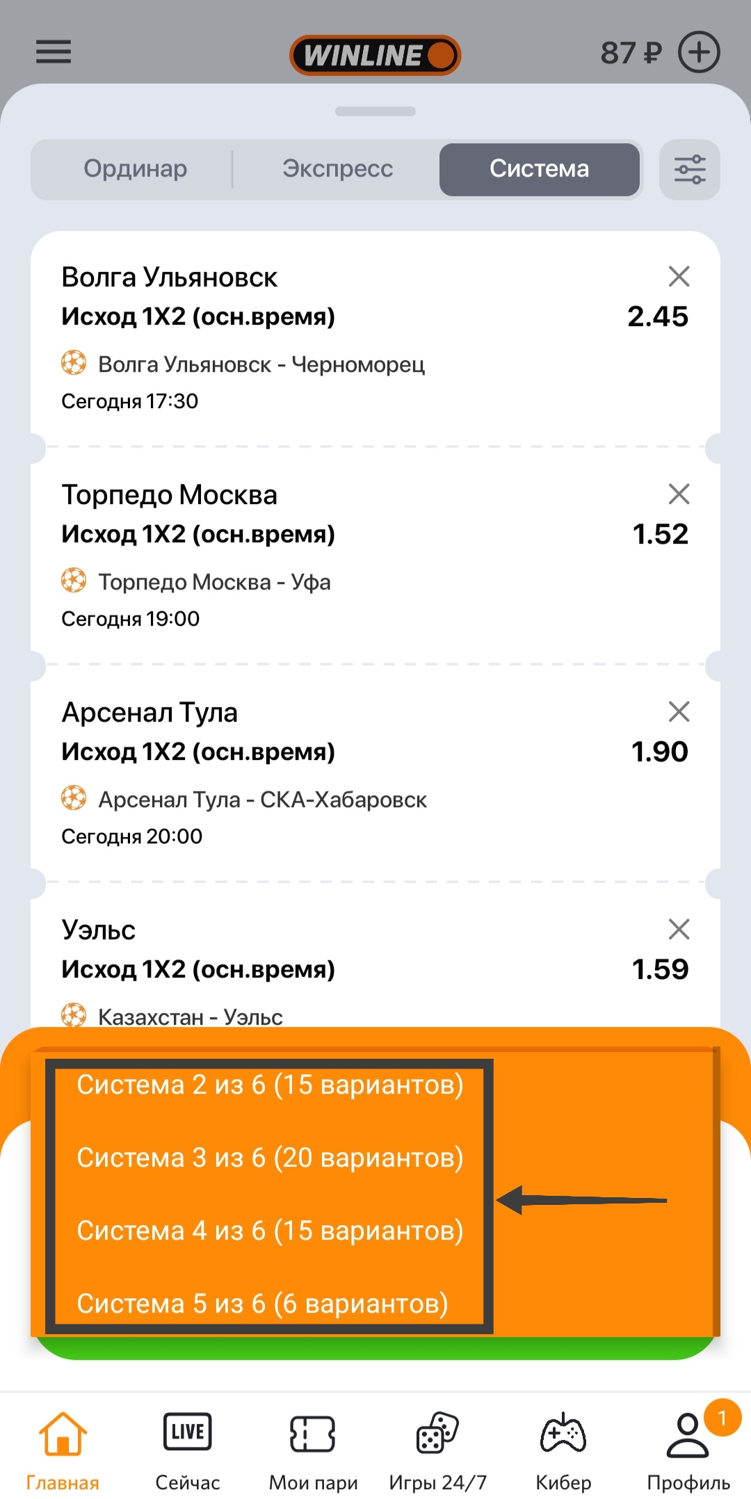 Разберем пример. Игрок добавляет в купон несколько спортивных событий, после чего выбирает систему, по которой нужно играть.