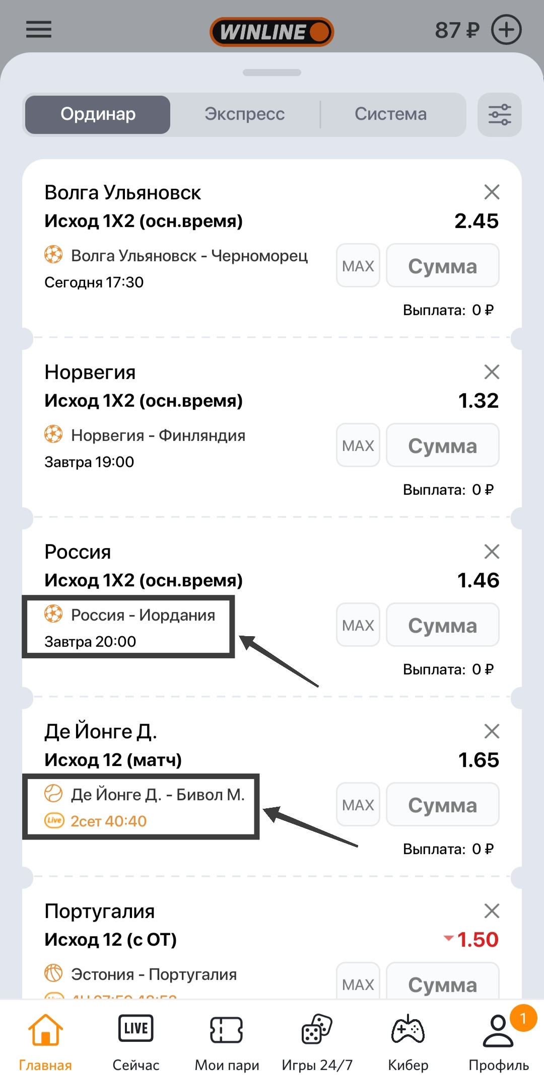 Для примера возьмем встречи «Норвегия — Финляндия» и «Россия — Иордания». Предположим, что клиент букмекерской конторы выбрал и добавил в купон 2 исхода: