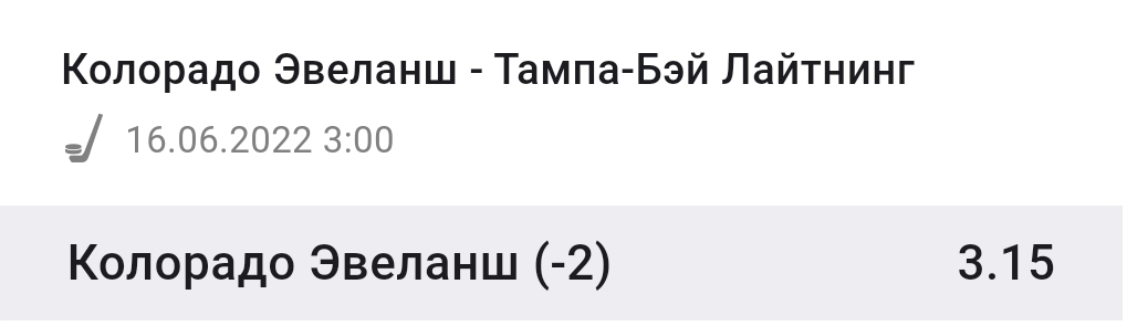 В матче НХЛ «Колорадо Эвеланш» — «Тампа-Бэй Лайтнинг» множитель на Ф1 (-2) был 3,15. Игра в основное время закончилась со счетом 3:3. После вычета гандикапа — 1:3. Ставка оказалась проигрышной.