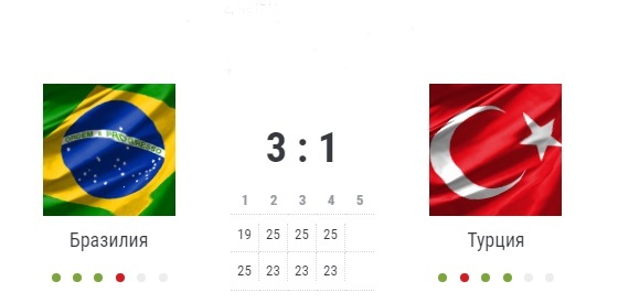 В игре Бразилия — Турция первая команда выиграла со счетом 79 очков, вторая набрала 70. Ставка Ф1(-2) на общий счет принесла бы прибыль, итоговый результат игры после вычета гандикапа 77-70. Пари на победу по сетам с форой 1 минус 2 закончилось бы возвратом средств, Бразилия выиграла 3 из них, Турция — 1. Итог: 1:1.
