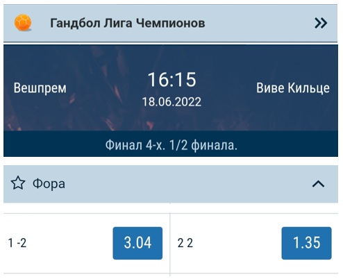 На матч Лиги Чемпионов «Веспрем» — «Виве Кельце» можно поставить на фору 1 минус 2 с коэффициентом 3.04.