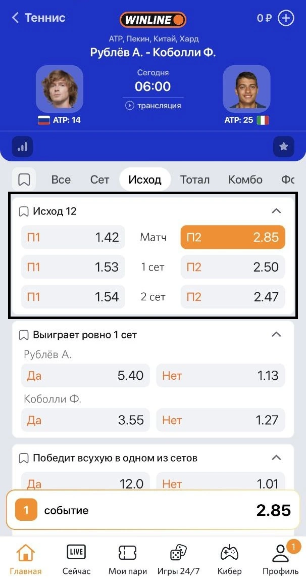 Для примера рассмотрим матч ATP между Андреем Рублевым и Флавио Коболли, который проходил в Пекине. На фактический исход П2 букмекерская контора дает высокий коэффициент — 2.85.