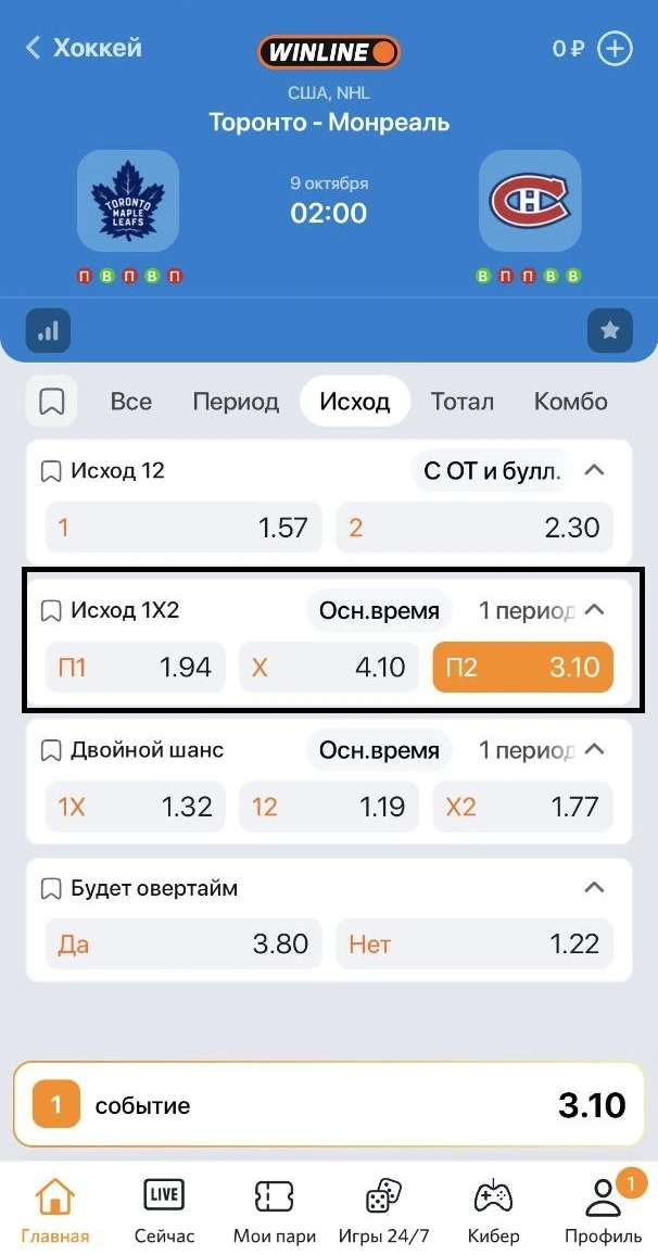 В букмекерской линии хоккея ставка П2 значит, что пари заключают на победу гостевой команды в основное время. Игроки также могут делать ставки на ничью. Хотя если лидера нет, в хоккее назначают овертайм или серию буллитов.
